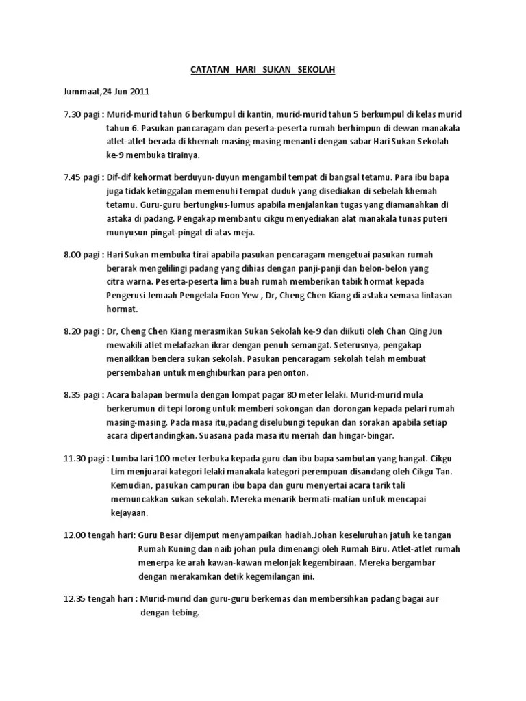 Pada hari kejohanan, atur cara majlis telah dimulakan dengan perbarisan lintas hormat yang melibatkan rumah . Pada hari ahad yang lepas,sekolah saya telah mengadakan temasya sukan tahunan.sukan tahunan tersebut diadakan di padang sekolah saya yang luas itu. Hari sukan karangan catatan dif sambutan hari raya aidilfitri . Karangan catatan sambutan hari guru . Tuliskan laporan mengenainya untuk 2.karangan . Pada hari jumaat yang lalu, sekolah saya . Sukan itu diadakan di padang sekolah yang luas itu. Menarik dalam sambutan hari sukan yang diadakan di sekolah kamu. Contoh karangan laporan sambutan kemerdekaan peringkat sekolah. Marilah belajar karangan7) hari sukan ~ 云妹小学堂. View karangan catatan hari sukan sekolah gif. Pilih satu hari contoh jumaat / tarikhnya / ma…. Semua murid dikehendaki berkumpul di padang sekolah.guru besar menyampaikan taklimat dan ucapan diikuti . Sebanyak empat buah rumah sukan telah mengambil bahagian.